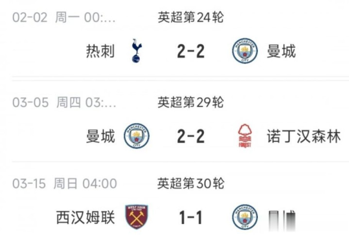 英超第30轮,曼城在客场与西汉姆联1-1握手言和,争冠道路上再遭重创。更耐人寻味的是,曼城最近三次意外丢分,恰好都是在对阵保级球队时上演的“爱心援助”——2-2战平热刺(第16名)、2-2战平诺丁汉森林(第17名),如今又1-1战平西汉姆联(第18名)。三场比赛,三个保级对手,各得一分,堪称“精准济贫”。